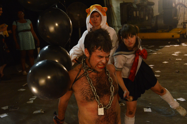 Naked with chains and balloons around his neck, Geraldo Mercado drags two cinder blocks tied around his wrists through the warehouse floor of the Gowanus Ballroom for one hour. If it ever seems like he is not putting in 100% effort into this ultimately futile and pointless task, he is whipped harshly by the two costumed women.